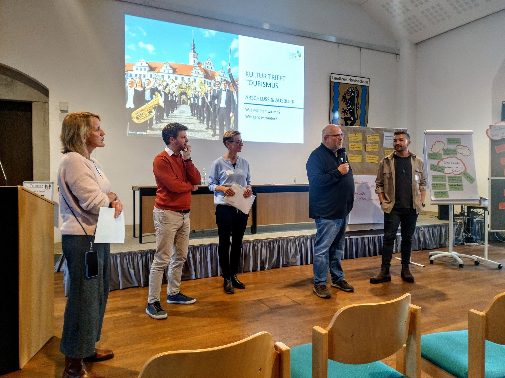 Im Rahmen des Kooperationslabors „Kultur trifft Tourismus“ wurde der Austausch weiter vertieft. In Kleingruppen entstanden im Format eines Speed-Datings weitere persönliche und fachübergreifende Kontakte, aus denen sich zukünftig neue Kooperationen entwickeln können. Zudem wurden die Bedarfe und Erwartungen der Teilnehmenden aus den Bereichen Tourismus und Kultur geäußert und miteinander verglichen. Während sich die Touristiker:innen beispielsweise verkaufbare Kulturpakete mit langfristiger Planbarkeit wünschen, sind gute Erreichbarkeit, Barrierefreiheit sowie digitale Buchungs- und Zahlungsmöglichkeiten für Kulturbetriebe wichtig. Die Ergebnisse wurden anschließend dem gesamten Publikum präsentiert.